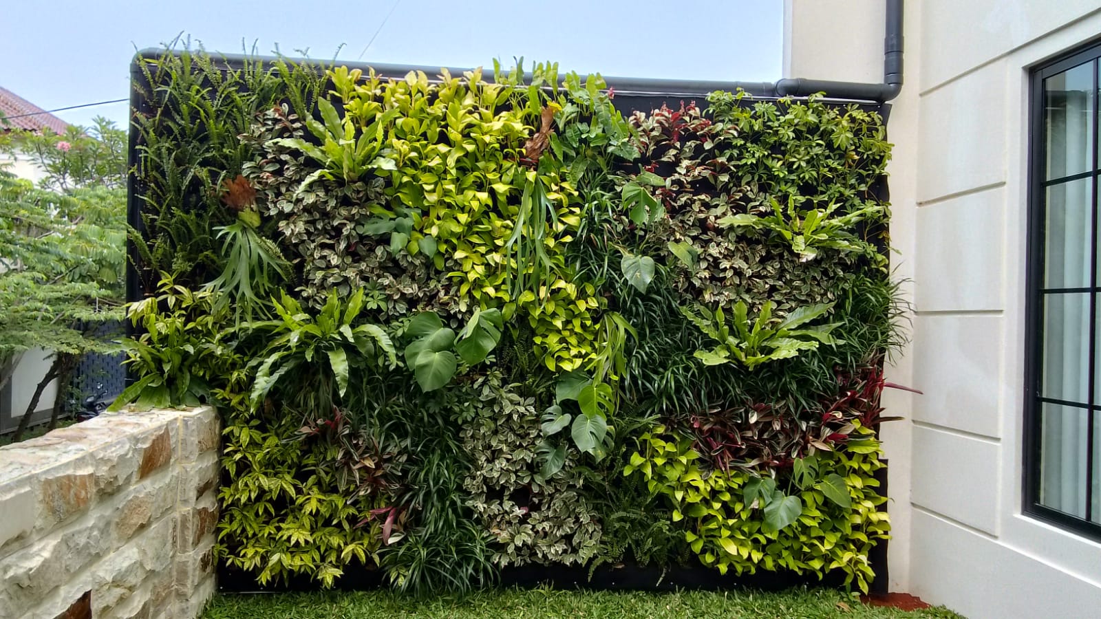 2. Vertical Garden Outdoor: Biasanya dipasang di dinding luar rumah atau gedung, menggunakan tanaman yang tahan terhadap cuaca dan perubahan suhu. Jenis ini sangat populer di Sentul, terutama untuk rumah yang memiliki dinding luar besar dan kosong.
